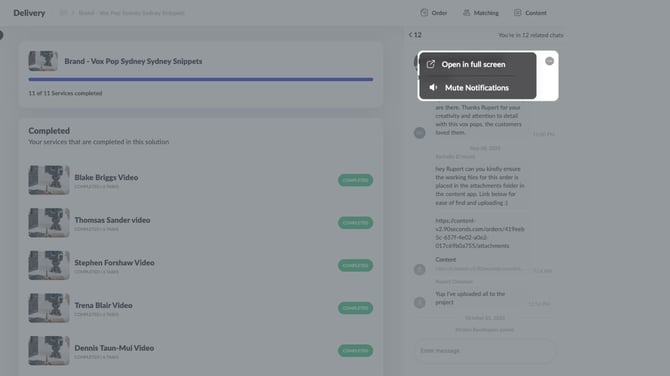 Open chatroom between Clients, Concierge, and Creator Team. Suitable for collaboration and communication throughout Delivery and Content stages. |