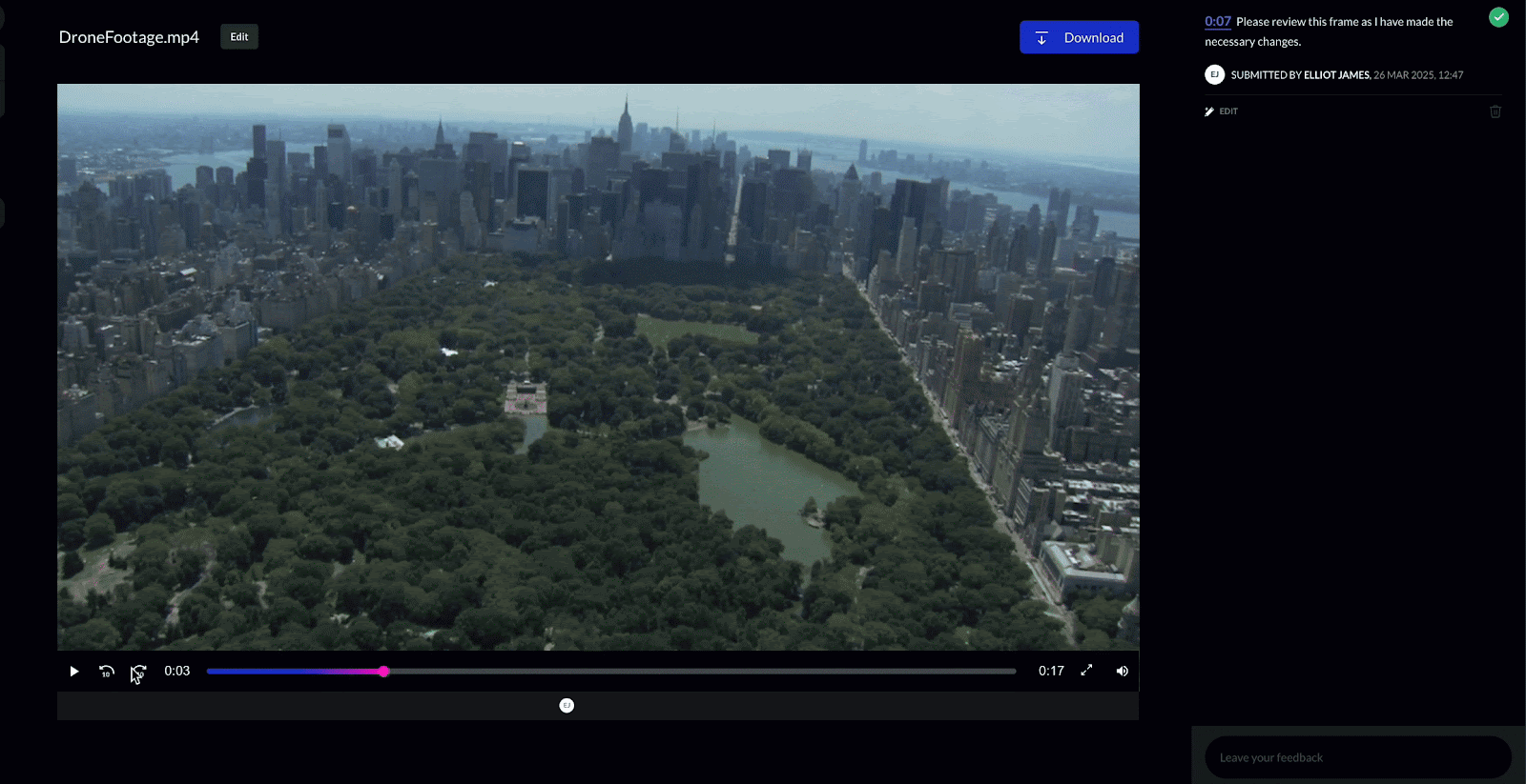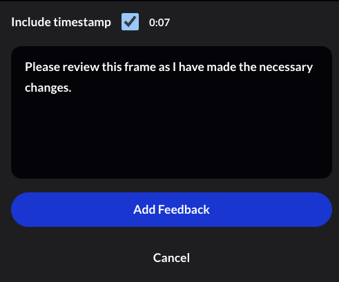 You are able to respond directly in the feedback chat. Select the time frame of the video which you have attended to feedback and add in the timestamps by clicking on the ‘Include Timestamp’ checkbox.