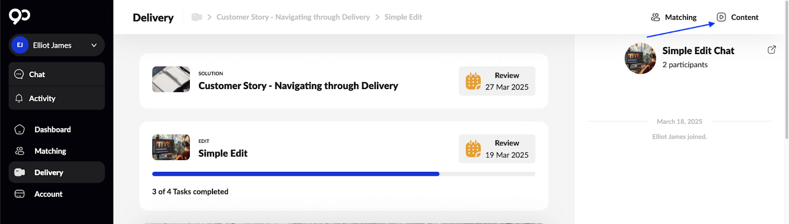On the Delivery Page, click on the ‘Content’ button on the top right of the page to access the Content App.