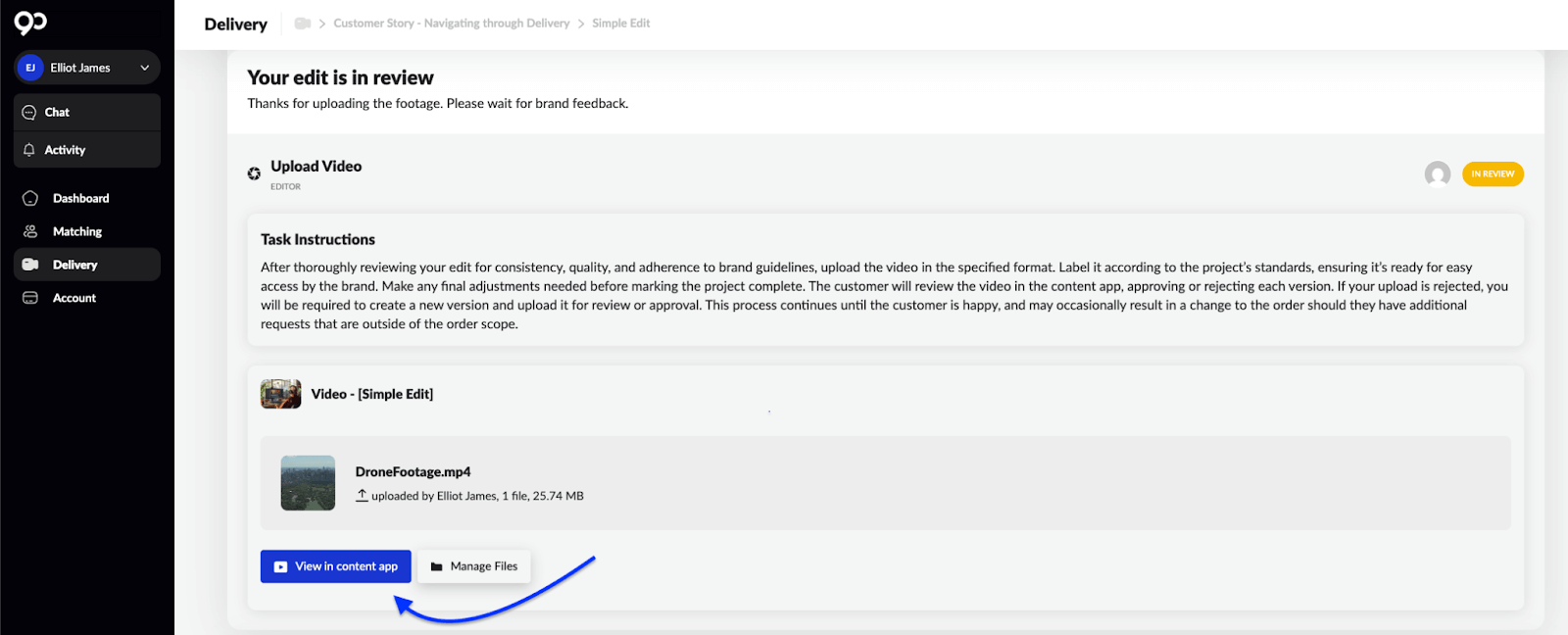 Another way to access the content app is to click on the ‘View in Content App’ Button under your upload task. The button will appear once you have uploaded files through the task.