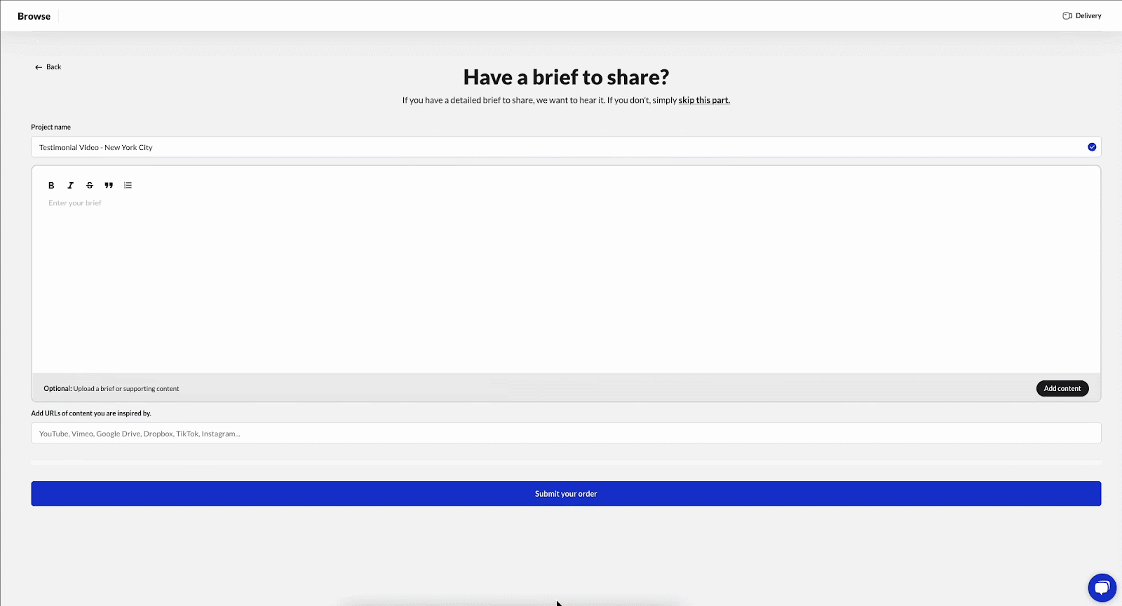 Sitting on a brief and need assistance with creating an order? Simply submit your brief through the platform and our Concierge Team will create an order for you.