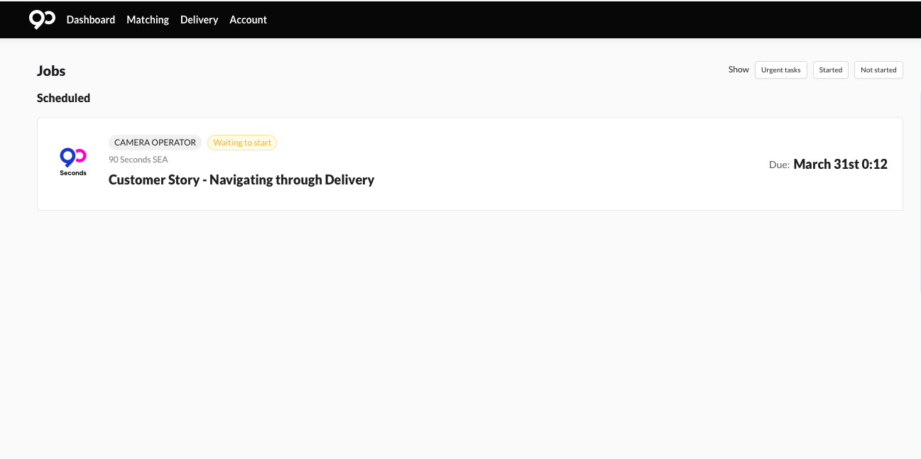 Alternatively, click ‘Delivery’ on your dashboard page and select a workflow through the filters on the menu or visit https://delivery.90seconds.com/