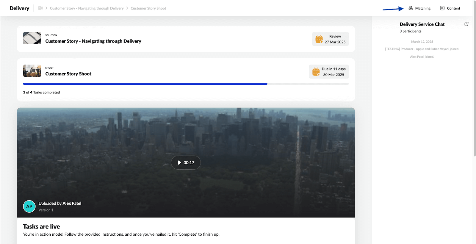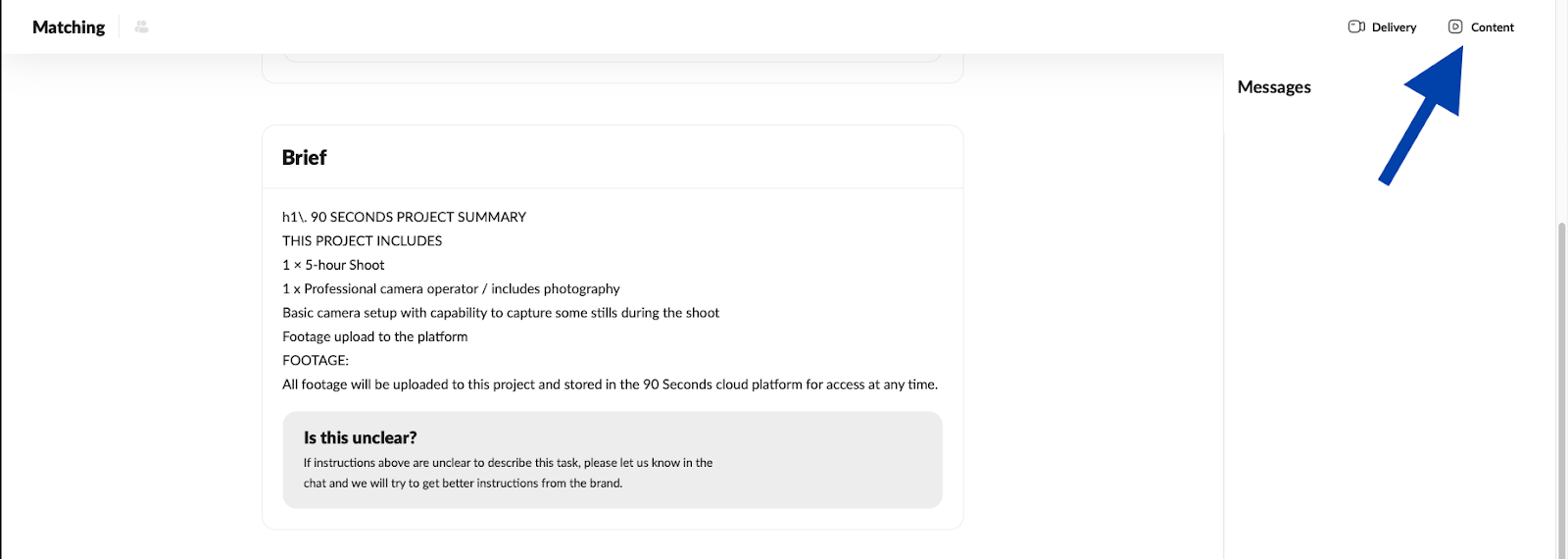 Once you're in the project, the brief can always be found in the Match app—just click on Matching at the top corner of your screen.