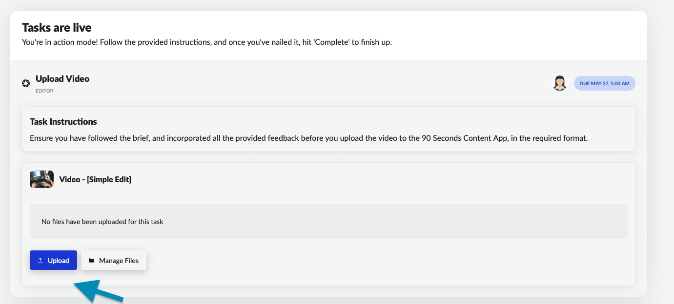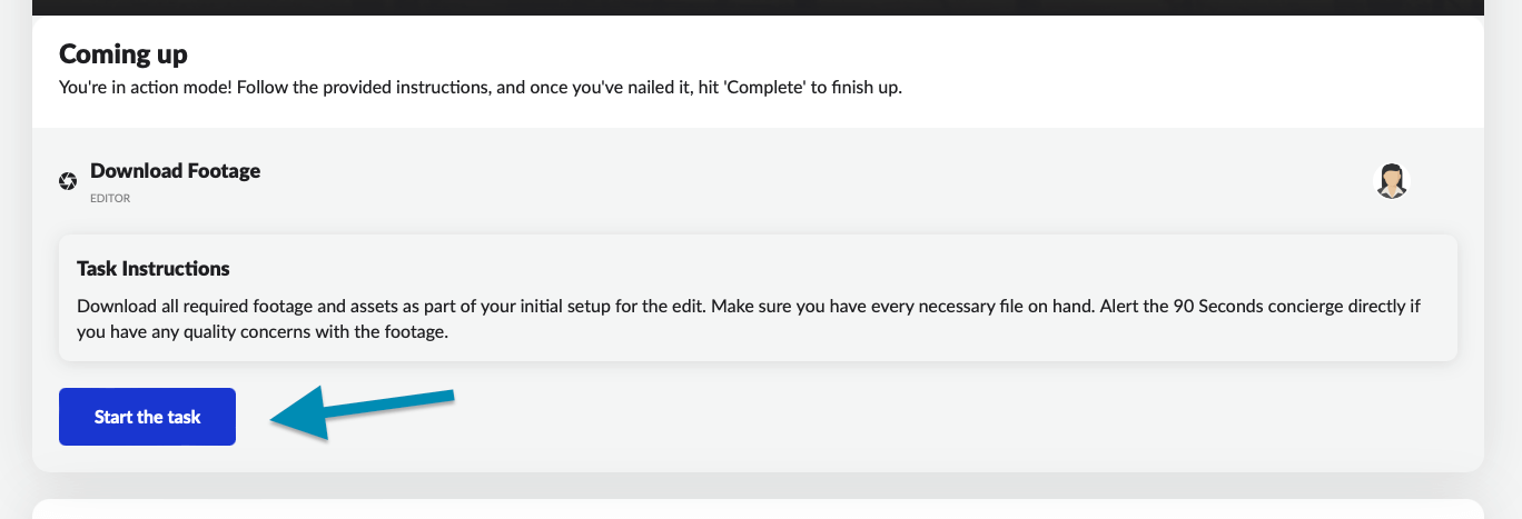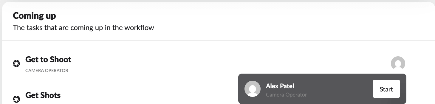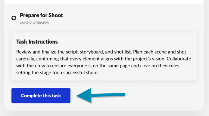 For example, the "Upload Footage" task won’t appear immediately; you first need to start and complete the "Prepare for Shoot" task. Similarly, editors must follow a structured process—beginning with "Prepare for Edit", then "Download Footage", and only after these steps can they access the "Edit Video" and "Upload Video" tasks.