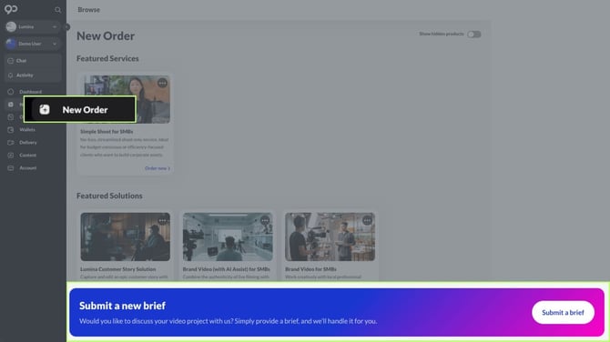To request a quote, simply navigate to New Order on the main Dashboard. Pick a service or solution from our public inventory, or from your Brand’s own private inventory (if products have been custom built for you). Alternatively, you may click Submit A Brief for a general request.